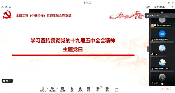 11月25日,betway·必威西汉姆联金融工程(中美合作)系师生融合党支部召开学习贯彻党的十九届五中全会精神主题党日活动,会议由党支部书记王江盼主持。