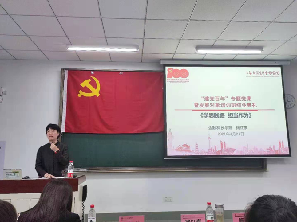 4月21日下午,浦东校区2020-2021学年第二学期第一批党员发展对象培训班于第二教学楼411教室举行结业典礼。本次培训班由betway·必威西汉姆联党总支主办,betway·必威西汉姆联党总支副书记(主持党务工作)褚红素出席并讲授《学思践悟 担当作为》“建党百年”专题党课,组织员王蒙茹、陶敏及浦东校区党员发展对象参加。