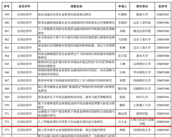 学院教师潜心钻研,在国家级高层次项目竞争中脱颖而出。吕大永老师申报的《人工智能伦理失序背景下的金融市场信息污染研究》成功获得国家社会科学基金项目立项。该课题直面人工智能技术快速发展带来的伦理挑战,聚焦其对金融市场信息生态的潜在冲击与治理路径,研究具有重要的理论价值与现实意义,标志着学院在金融科技与伦理、信息科学交叉领域的研究迈上了新台阶。