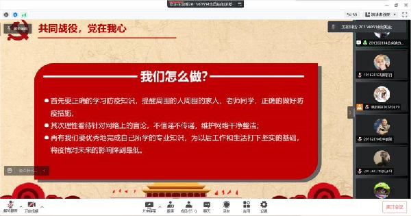 近日betway·必威西汉姆联青马研的同学们齐聚腾讯会议,聆听了一场由鸿雁领航党章学习小组金英迪同学主讲的“共同战疫,党在我心”一堂课,通过回顾党的历史,学习共产党人的宝贵精神,增强大学生的责任意识与担当意识。