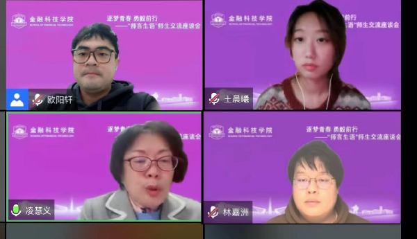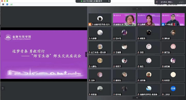 座谈会上,各年级同学代表畅所欲言,就目前的学习、生活等方面与老师进行交流。有的聚焦在线学习效率、考证等,有的提出选课方面的困惑,有的围绕少数民族学生成长需要,有的提出希望参加学院提供的实习就业机会,有的就“一站式”学生社区建设提出建议……老师们针对同学们提出的问题逐一耐心解答,副院长(挂职干部)吴慧就学院产学研拓展情况进行介绍并回答学生选课中遇到的问题,金融科技系黄陆斐老师就学生专业课学习、科创发展等进行解惑与指导,辅导员张文鹏老师解答了学生创新实践学分认定和实习实训、学校防疫等相关问题。虽然会议是在线进行,但隔屏不隔心,学院师生交流互动热烈。
