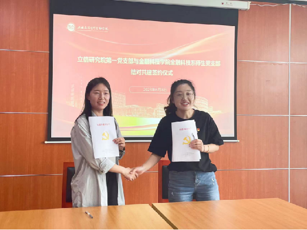 签约仪式上,金融科技系师生党支部书记卢庚宿、立信研究院第一党支部书记张海燕同志介绍了支部基本情况及党建工作情况,签署了《党支部结对共建协议书》。