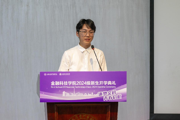 新生代表、2024级金融科技3 班吴昊琦代表全体新生承诺,将“立诚明德,经世致用”的精神牢牢镌刻在心中,将“民无信不立”的铮铮铁骨融进血肉,以青春之名,书写属于金科的精彩篇章。