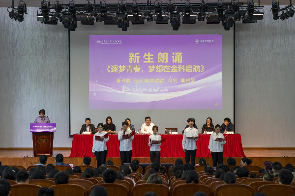 2024级新生代表朗诵《逐梦青春,梦想在金科起航》,宣示金科学子不畏艰险、不惧挑战,以梦为帆、以诚为桨的昂扬精神。