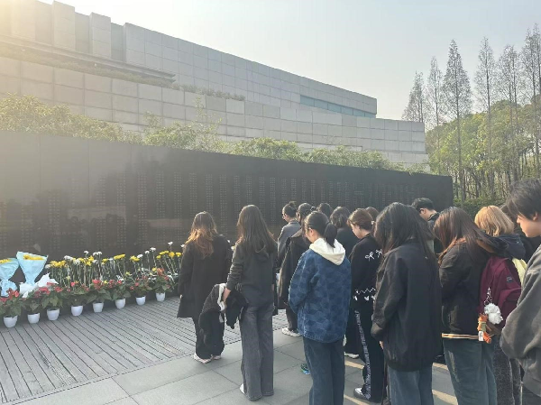 高桥烈士陵园庄严肃穆,巍峨的烈士纪念碑上镌刻着时任上海市市长陈毅同志的题词“为解放上海而牺牲的英雄们永垂不朽”。在烈士英名录墙前,全体同学整齐列队,肃立默哀,向革命先烈敬献花束并鞠躬致敬。