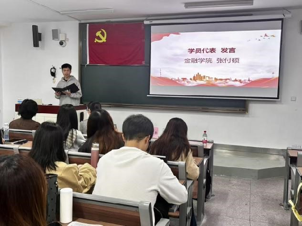 金融学院学生张付硕作为学员代表发言,他援引习近平总书记的重要论述,结合党的百年征程,强调青年应融入党和国家事业。代表全体学员表态将勤学理论、严以律己、实干践行初心,呼吁以培训筑牢信仰,为民族复兴献力。