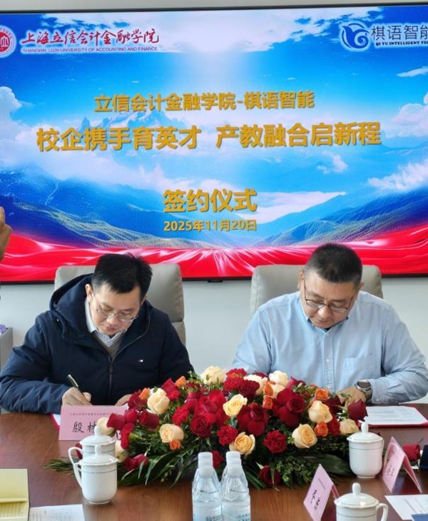 2025年11月20日,我院代表学校与上海棋语智能科技有限公司(以下简称“棋语智能”)在上海市静安区市北壹中心举行产学研合作签约仪式。双方以“校企携手育英才,产教融合启新程”为主题,正式开启在人才培养、技术创新等领域的深度合作。上海外国语大学贤达经济人文学院党委书记赵荣善作为特邀嘉宾出席。我院党总支副书记、院长殷林森,副院长程宏等,与棋语智能董事长肖忠华,董事胥陈、夏海军等出席仪式。
