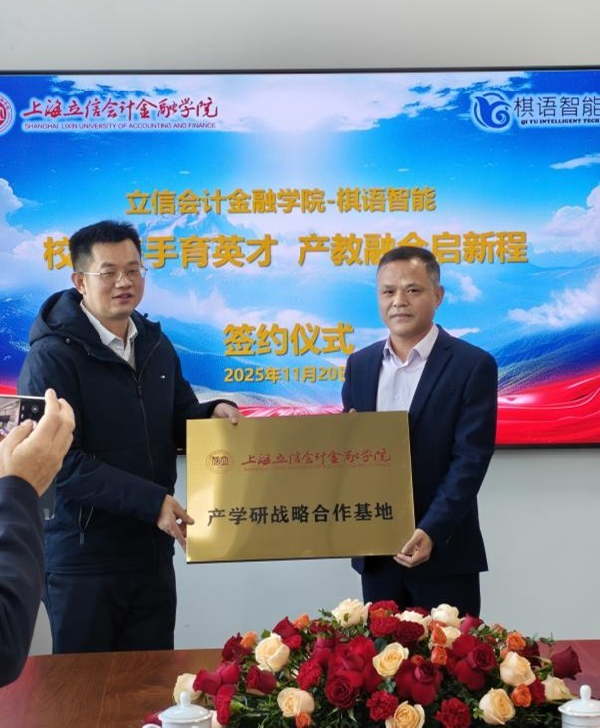 在全场嘉宾的见证下,殷林森院长与肖忠华董事长作为双方签约代表,共同签署《产学研合作协议》。根据协议,双方将在学生实习实践、科研项目合作等方面开展具体合作。签约完成后,学院向棋语智能授予“产学研合作基地”牌匾,标志着合作进入实质性落地阶段。