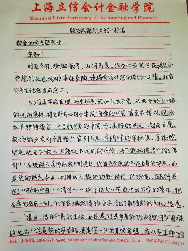 活动三 一等奖书信作品《致方志敏烈士的一封信》 陶紫晴 221470117