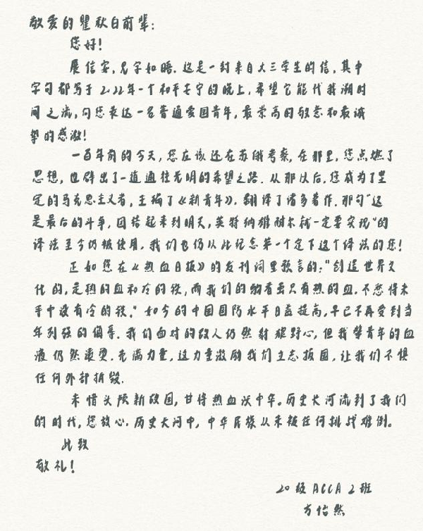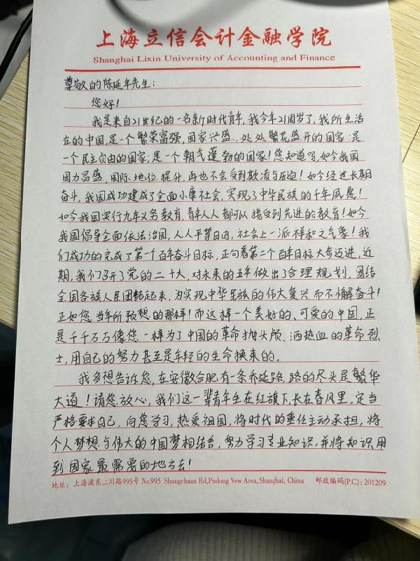 活动三 一等奖书信作品《致陈延年先生的一封信》 韩雪宁 201620219