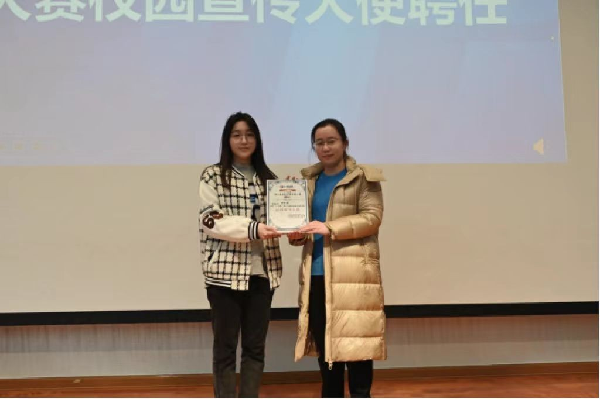 校团委书记李羽佳为我院田佳鹭同学颁发大赛校园宣传大使聘书。